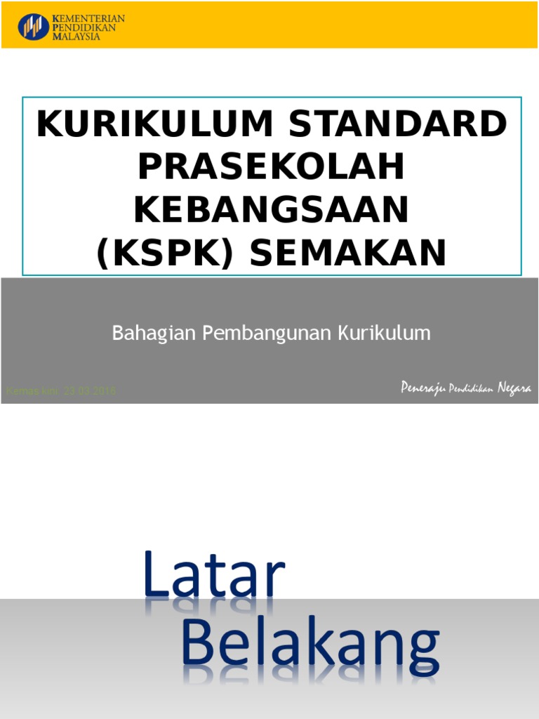 Tujuan pentaksiran prasekolah adalah seperti berikut. Dapatan Rumusan Cadangan Kajian ini bertujuan untuk meneroka kesan perubahan Kurikulum Standard Prasekolah Kebangsaan PKPP Malaysia terhadap guru prasekolah. Sila muat turun pada link di bawah KSPK SEMAKAN 2017 Brosur KSPK SEMAKAN 2017 Taklimat Umum KSPK Semakan 2017 Tunjang Komunikasi KSP.